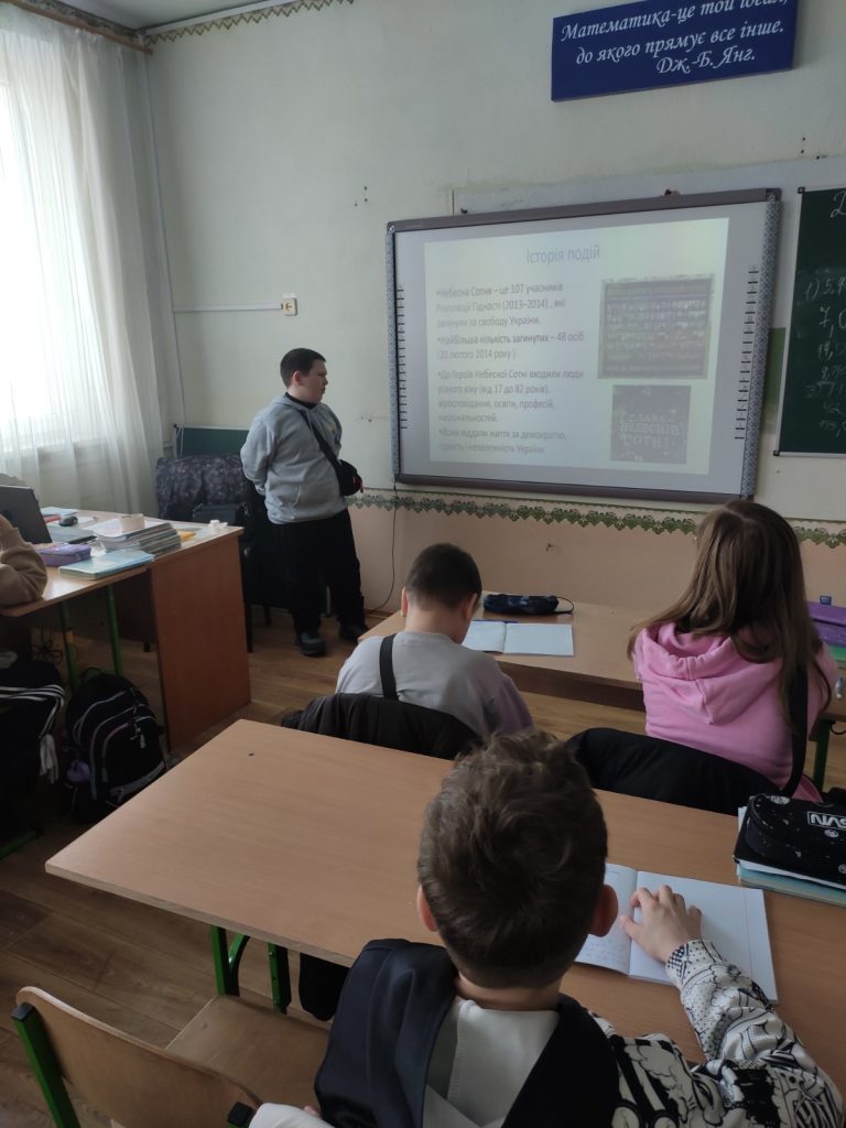 Учні вшанували пам’ять загиблих хвилиною мовчання, обговорили поняття мужності, єдності та любові до Батьківщини. Також п’ятикласники виконали тематичні завдання: відповідали на запитання, працювали з короткими фактами та ілюстративними матеріалами, складали асоціативний ряд до слова «герой» і робили висновки про важливість збереження історичної пам’яті.