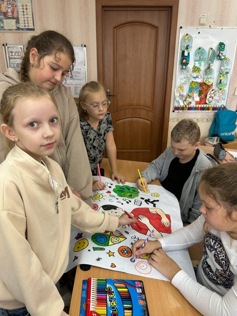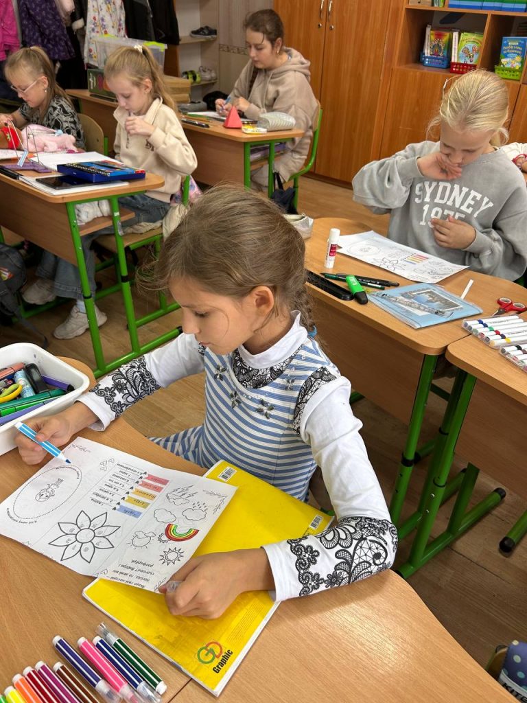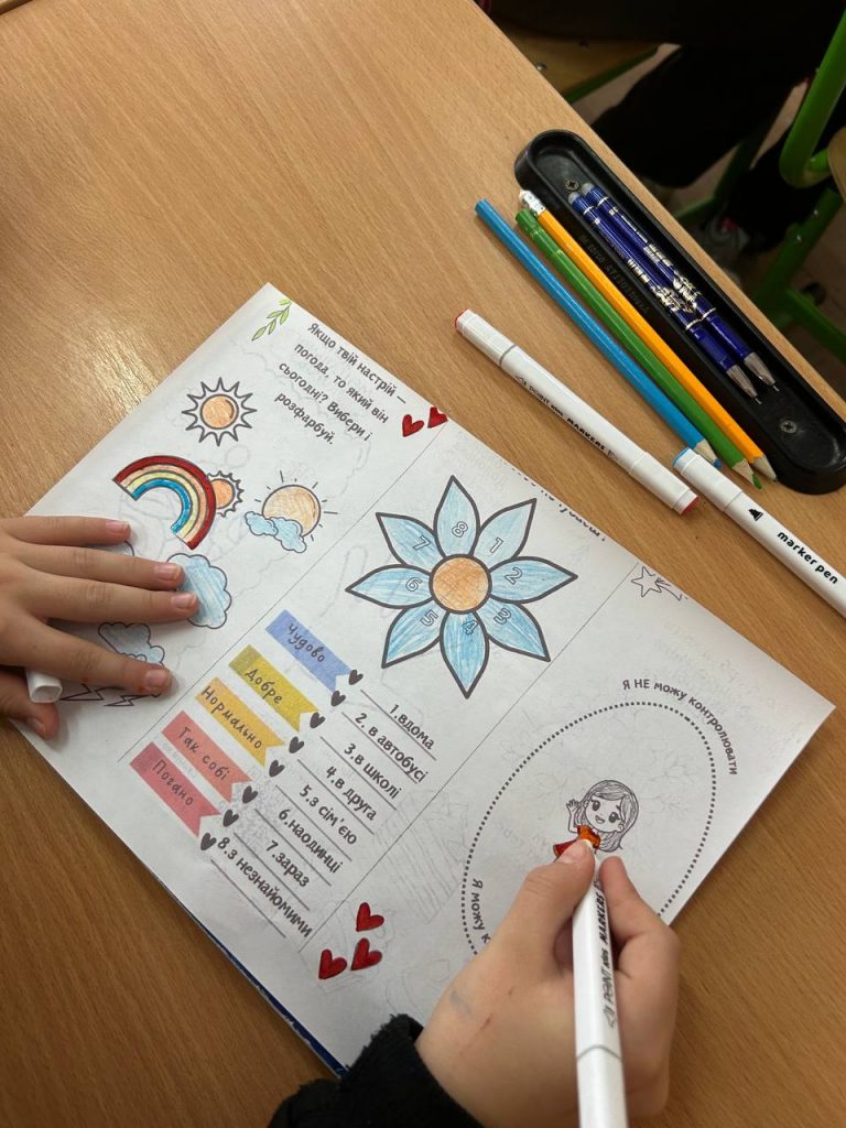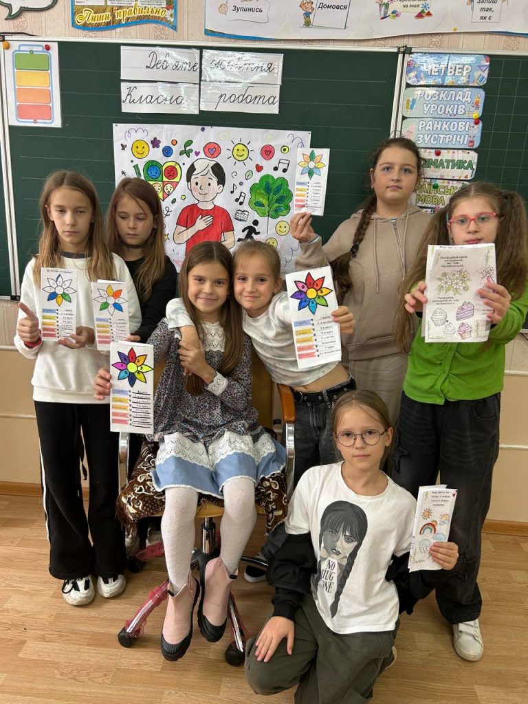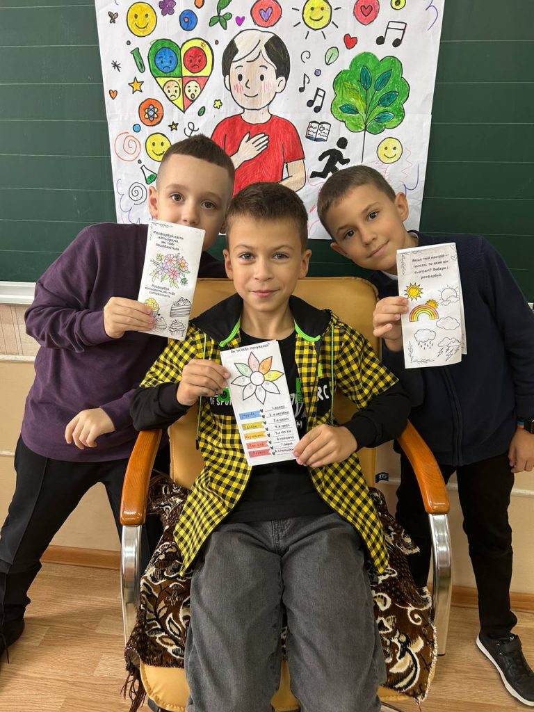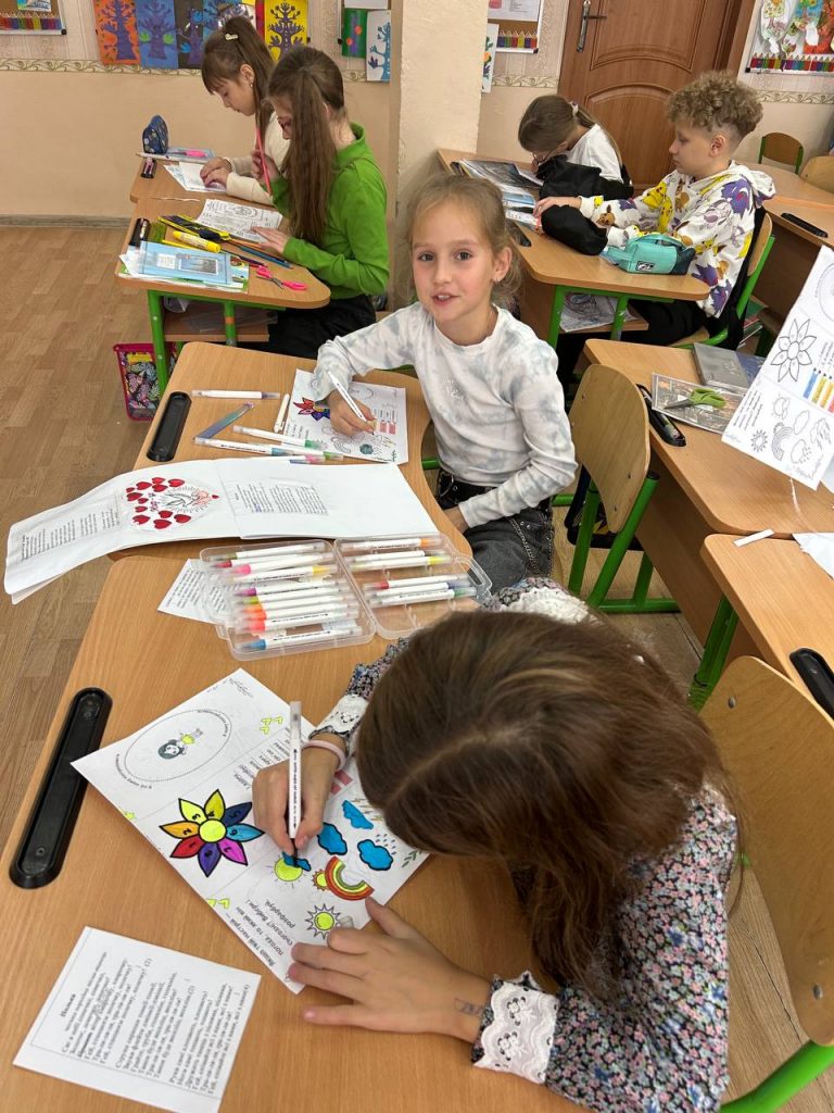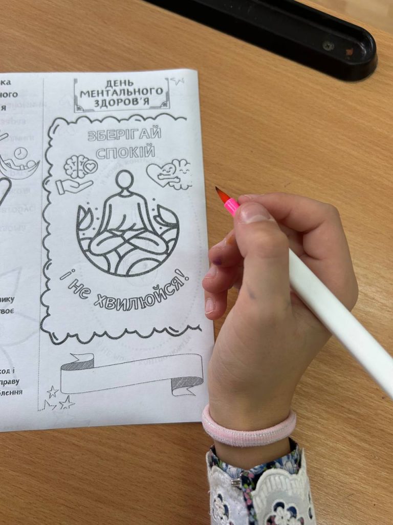Діти активно обговорювали, що допомагає людині відчувати спокій і гармонію, ділилися своїми маленькими секретами гарного самопочуття. Разом школярі розфарбували тематичну розмальовку, створюючи яскраву атмосферу радості, а також підготували буклети “Як підтримувати себе”, у яких зібрали поради, малюнки та власні думки про позитивне мислення, дружбу і доброту.