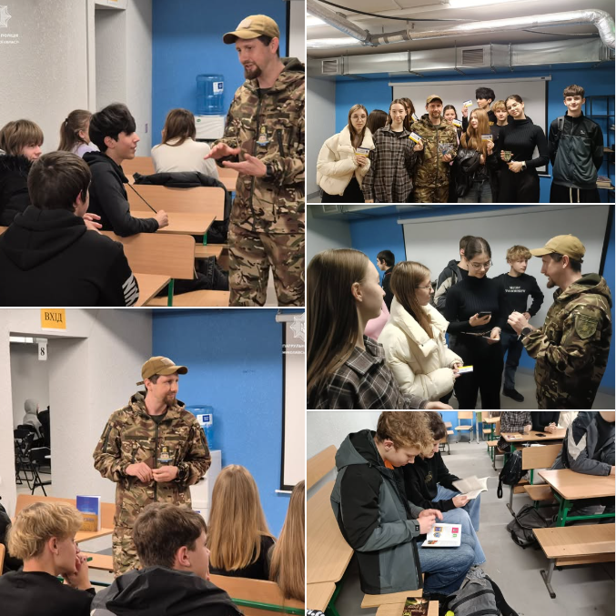 У ліцеї відбулася зустріч учнів 10-х класів із захисником України, із поліцейським Дмитром Бажиним — патрульним, який брав активну участь у бойових діях на сході нашої країни. Під час зустрічі Дмитро презентував свої авторські книги, поділився власним бойовим досвідом, розповів про службу, труднощі та цінності, які допомагають військовим залишатися сильними.